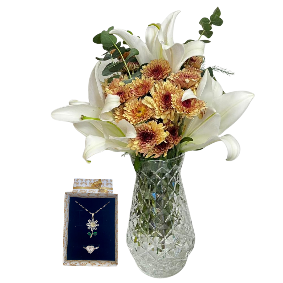Krem rengi kasımpatılar ve beyaz lilyumlar, okaliptus ve virgatüs dallarıyla doğal bir uyum içinde sunuluyor. Kristal silindir cam vazoda özenle hazırlanmış bu aranjman, sade ve zarif bir görünüm sağlıyor. Yanına eklenen papatya kolye ve Pandora yüzük seti, hediyenize neşeli ve zarif bir dokunuş katarak özel anları daha anlamlı ve unutulmaz kılıyor.