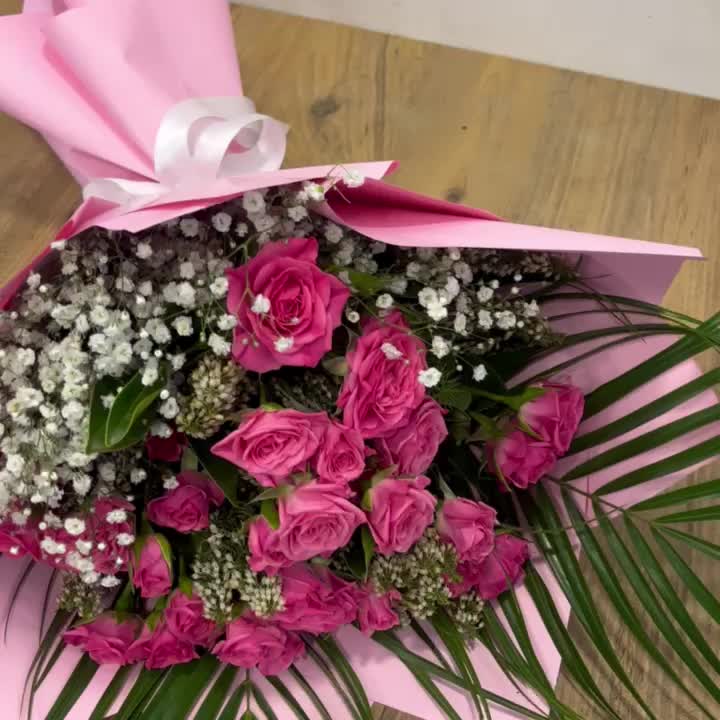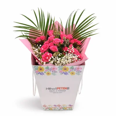 Yaklaşık 50 cm yüksekliğinde pembe çardak güller ile hazırlanmış el buketi modelimiz