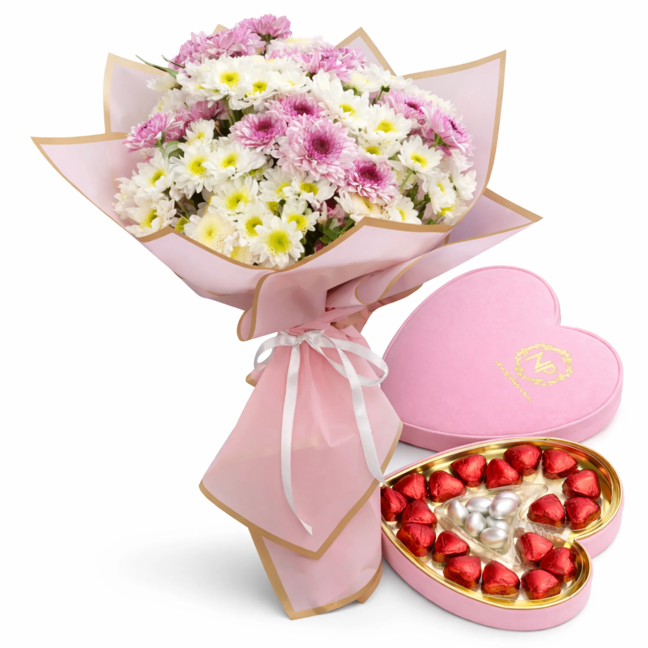 Pembe ve beyaz krizantemlerden oluşan hacimli buket, pastel pembe kalp formunda premium çikolata kutusu ile bir araya getirilerek romantik bir hediye setine dönüştürüldü.