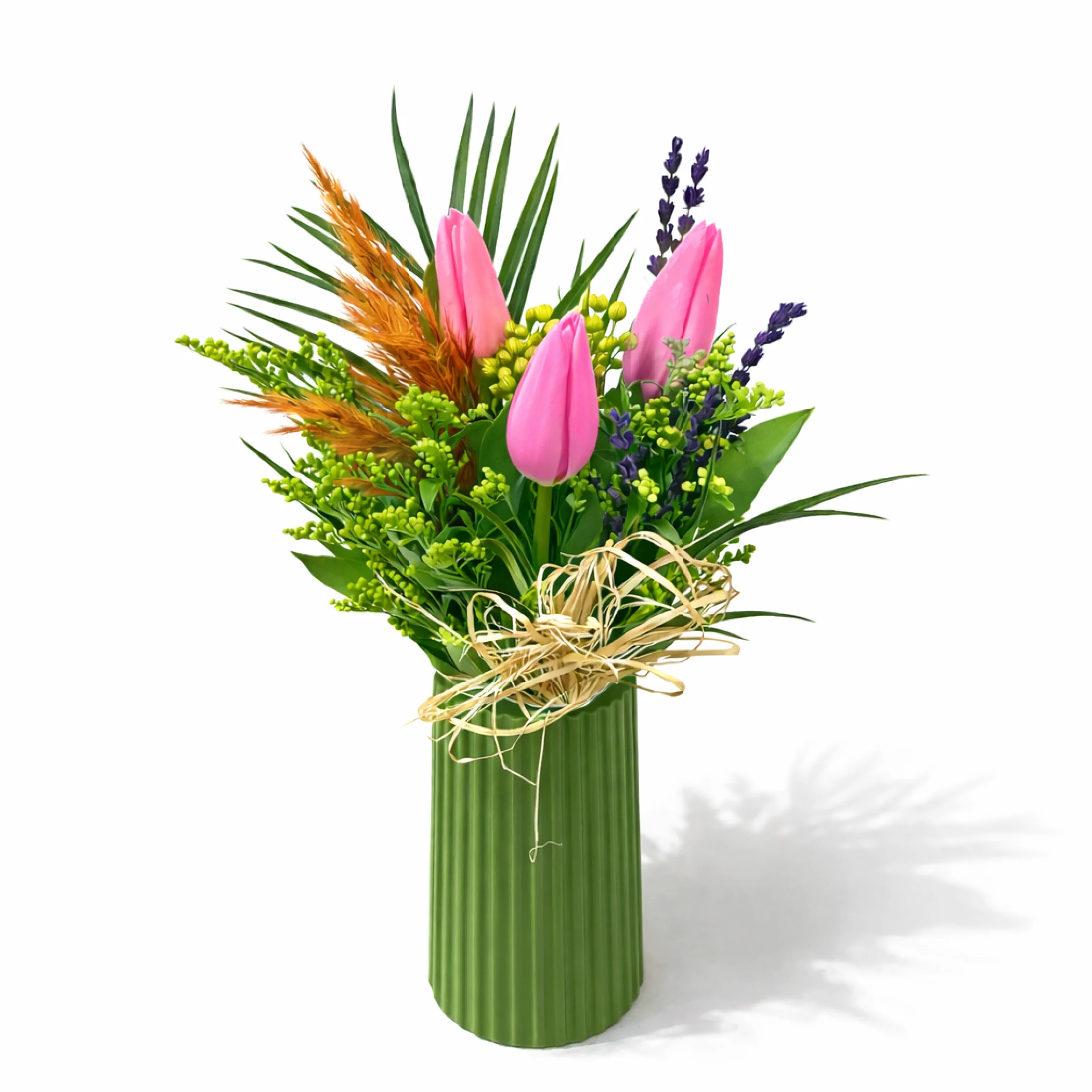 Doğal rafya süslemesi ve modern çizgili yeşil vazo tasarımı, aranjmana hem modern hem de sıcak bir görünüm kazandırır. Küçük ama etkileyici bu tasarım; doğum günü, teşekkür, yeni iş tebriği veya sevdiklerinize sürpriz yapmak istediğiniz her an için zarif bir hediye alternatifidir.