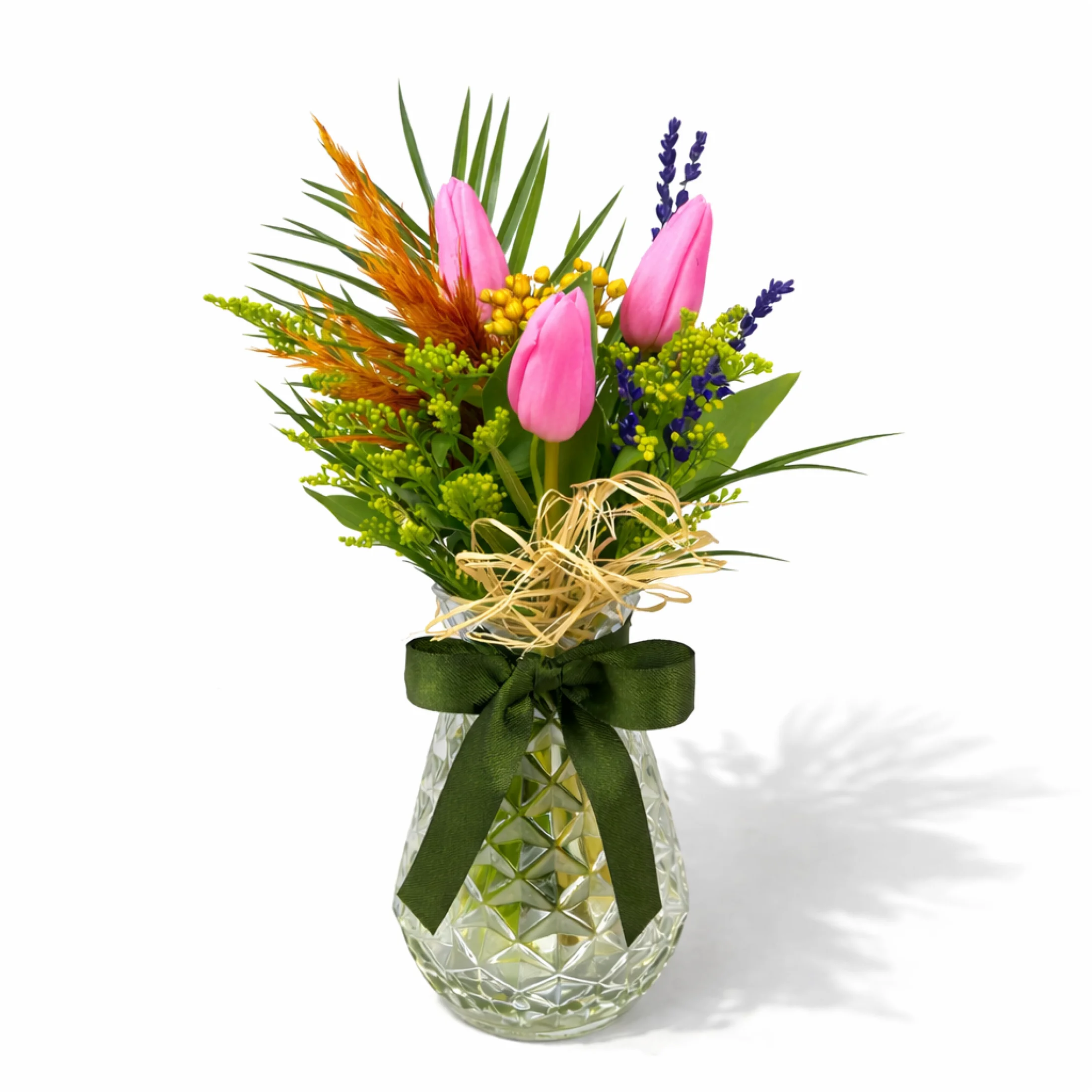 Doğal zarafet ve canlı renklerin uyumunu yansıtan Pembe Lale Lavanta Zarafeti Vazo Aranjmanı, cam dekoratif vazo içerisinde hazırlanan şık ve modern bir çiçek tasarımıdır. Aranjmanın merkezinde yer alan 3 adet pembe lale, sevgi, zarafet ve içten duyguları simgeler. Lavanta dalları, dekoratif yeşillikler ve doğal kuru çiçek dokunuşları ile zenginleştirilen bu tasarım, bulunduğu ortama ferah ve doğal bir atmosfer kazandırır.