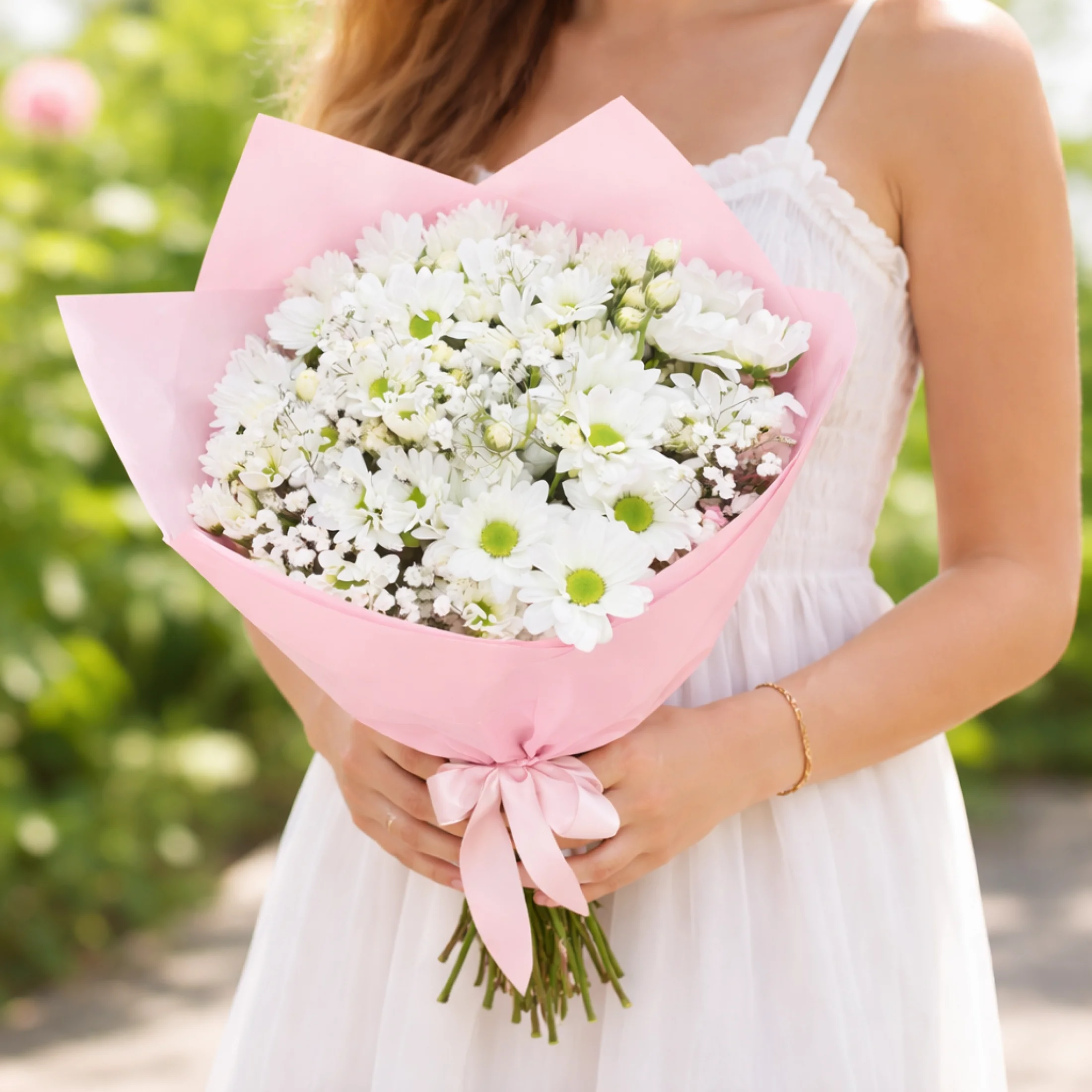 Pembe detaylarla şıklığı tamamlanan bu özel papatya buketi, sadeliğin içindeki büyüleyici güzelliği yansıtır. Beyaz papatyaların ferah ve temiz enerjisi, pembe dış süslemenin romantik dokunuşuyla birleşerek hem zarif hem de dikkat çekici bir görünüm sunar.