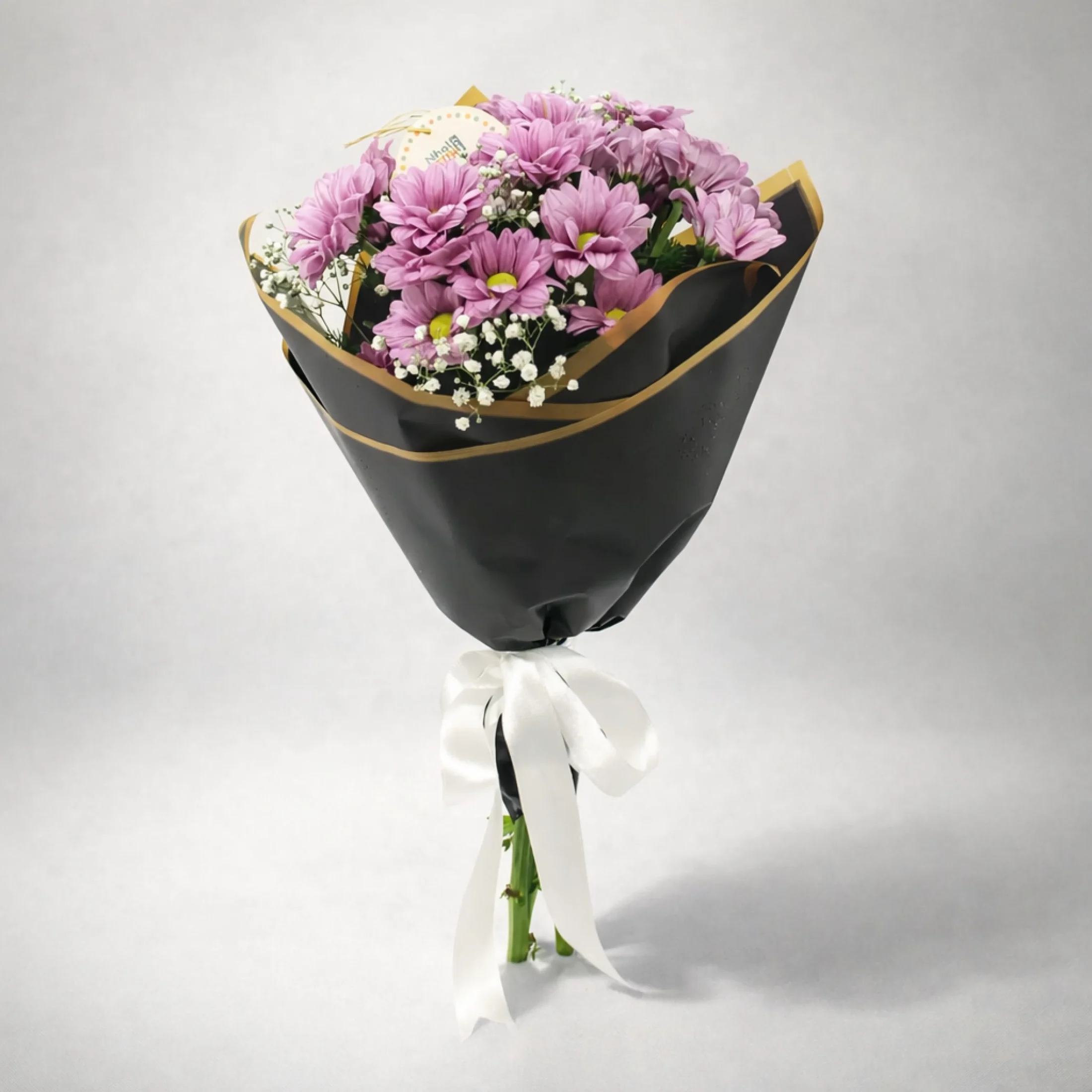 Pembe Papatya buketinin hazırlanmasında kullanılan çiçekler, yardımcı bitkiler, buket kağıdı ve kurdele; uyumlu bir renk ve form dengesi yakalamak için özenle seçilir. Reçete, buketin her seferinde aynı kalite ve estetikle hazırlanmasını sağlayan bir rehber niteliğindedir. Böylece sipariş ettiğiniz ürün, görsel bütünlüğünü koruyan, dengeli ve dolgun bir aranjman olarak size ulaşır. Kullanılan siyah buket kağıdı, pembe papatyaların rengini öne çıkarırken; beyaz saten kurdele bukete zarif bir son dokunuş katar. Yardımcı çiçekler ise hem hacim kazandırır hem de papatyaların doğal güzelliğini destekler.