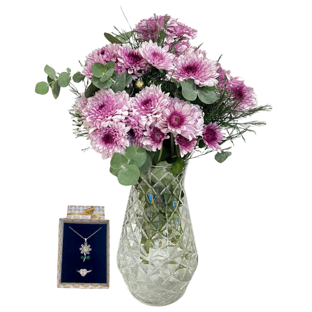 Kristal silindir vazonun içinde özenle yerleştirilmiş pembe kasımpatı, taze okaliptüs ve yeşil virgatüslerden oluşan bu aranjmanın yanına eklenen papatya kolye ve Pandora yüzük seti, hediyenize zarif ve neşeli bir dokunuş katıyor. Papatya tasarımı, masumiyet ve tazeliği simgelerken, şık yüzük seti ile birlikte sevdiklerinize unutulmaz bir hediye deneyimi sunuyor. Aranjman, hem görsel hem de duygusal olarak özel anları vurguluyor.