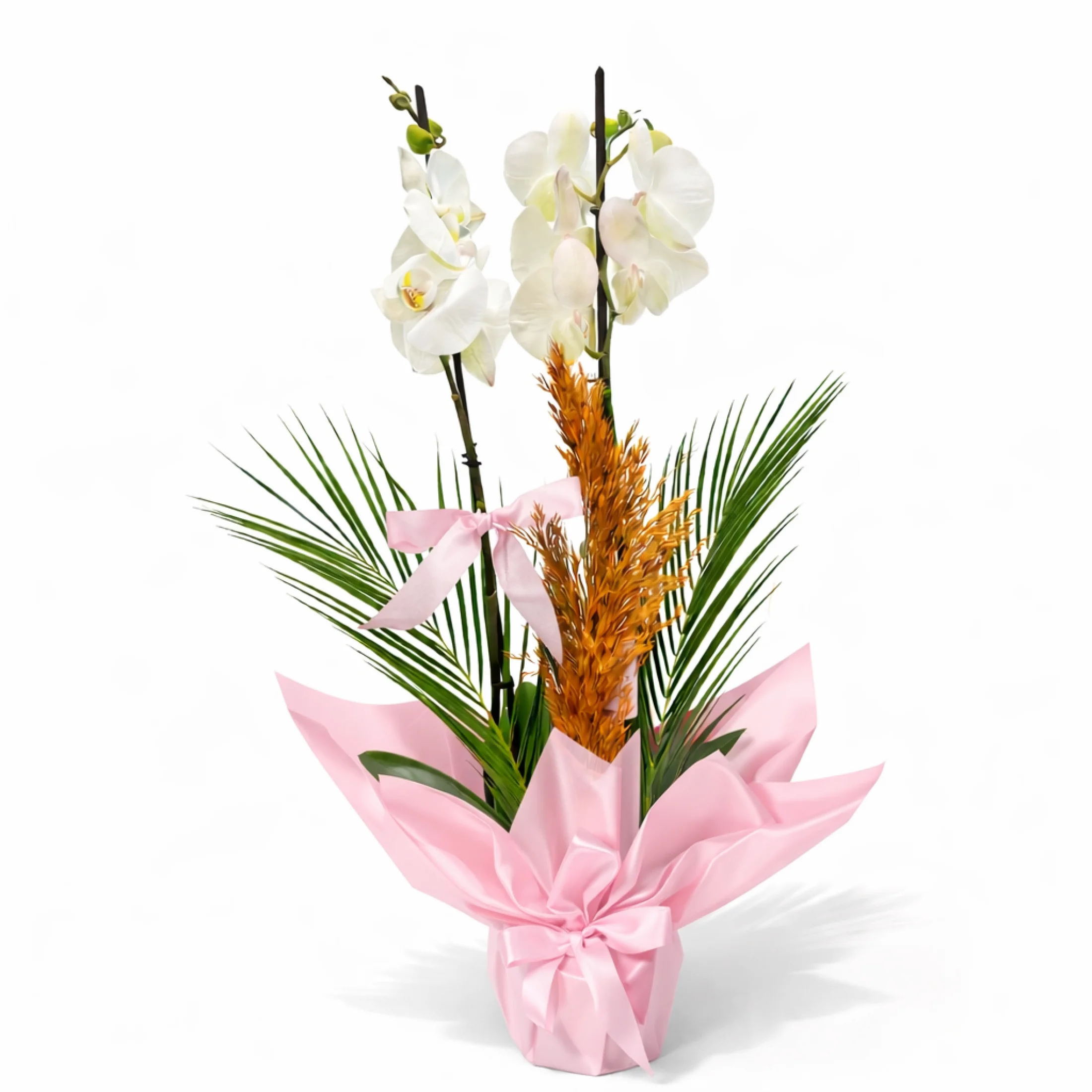 Bu aranjmanda yer alan 2 dal canlı beyaz orkide, saflığı ve zarafeti temsil eder. Doğal yeşil yapraklar ve dekoratif süsleme detaylarıyla zenginleştirilen tasarım, modern görünümüyle dikkat çeken pudra pembe buket kağıdı ile paketlenmiştir. Soft pembe tonları orkidenin doğal güzelliğini daha da ön plana çıkararak romantik ve estetik bir görünüm sunar.