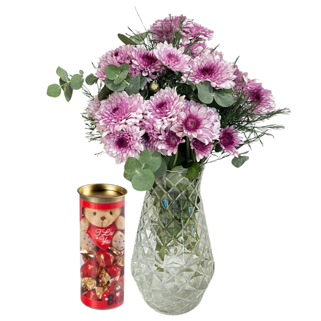 Kristal silindir vazonun içinde özenle yerleştirilmiş pembe kasımpatı, taze okaliptüs ve yeşil virgatüslerden oluşan bu aranjmanın yanına eklenen silindir kutuda ayıcıklı çikolata, hediyenize tatlı ve sevimli bir dokunuş katıyor. Hem lezzetli hem de şık sunumuyla çikolata, aranjmanın görselliğini tamamlayarak sevdiklerinize unutulmaz bir sürpriz sunuyor.
