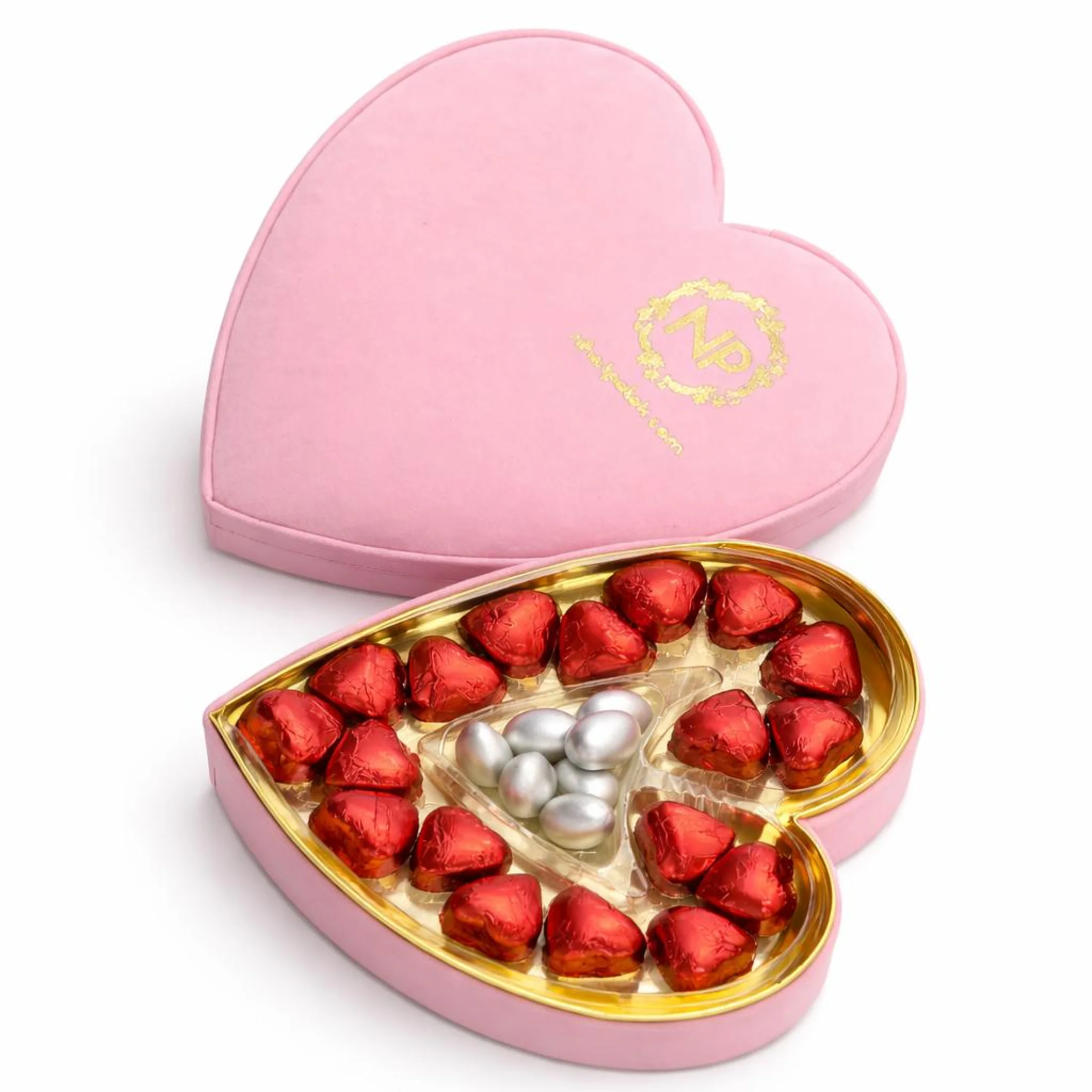 Zarafetin ve romantizmin en şık hali… Pembe VIP Kalp Çikolata Kutusu, kadife dokulu özel tasarım pembe kalp kutusu içerisinde özenle dizilmiş kırmızı kalp çikolatalar ve özel drajelerle hazırlanmıştır. Gold detaylı iç tasarımı ve premium sunumu sayesinde hem göz alıcı hem de duygusal bir hediye alternatifi sunar.