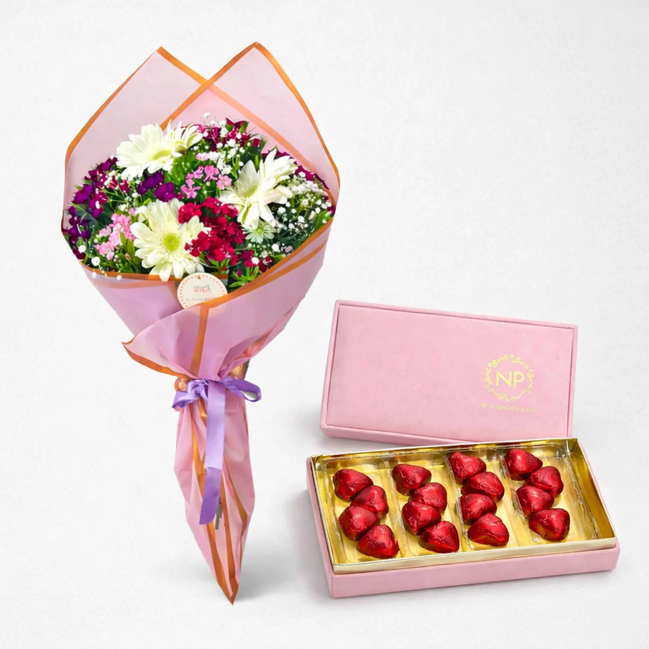 Canlı beyaz papatyalar, mor ve fuşya ara çiçekler, cipso dokunuşları ve zarif pembe ambalaj tasarımı ile hazırlanan buket; şık pembe kutusunda sunulan kalp çikolatalarla birlikte hem gözlere hem kalbe hitap eder.