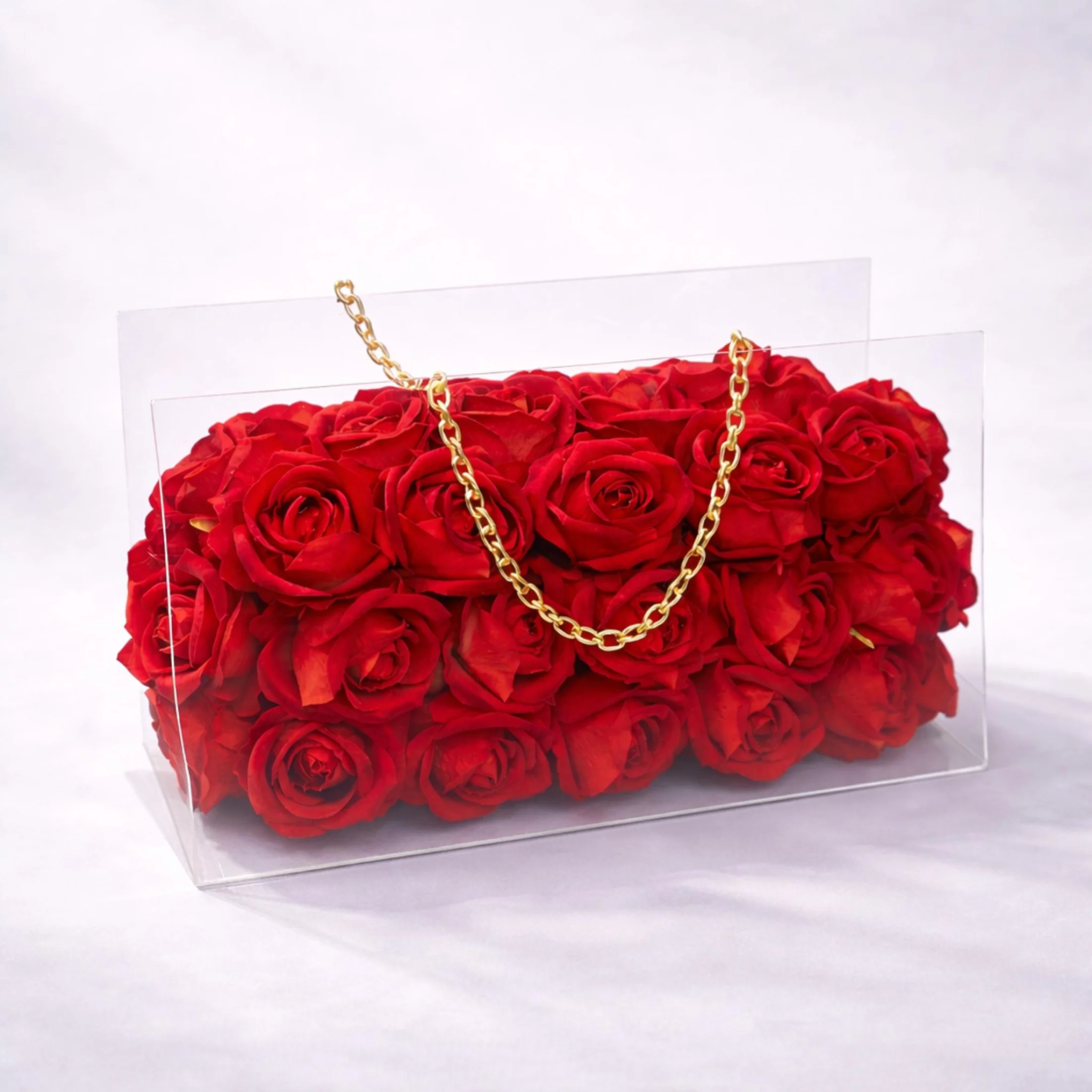 Luxury Rose Bag, canlı kırmızı güllerin şeffaf akrilik çanta formunda modern ve lüks bir tasarımla buluştuğu özel bir aranjmandır. Altın renk zincir detayı ile tamamlanan bu tasarım, klasik çiçek anlayışının ötesine geçerek fark yaratmak isteyenler için hazırlandı.