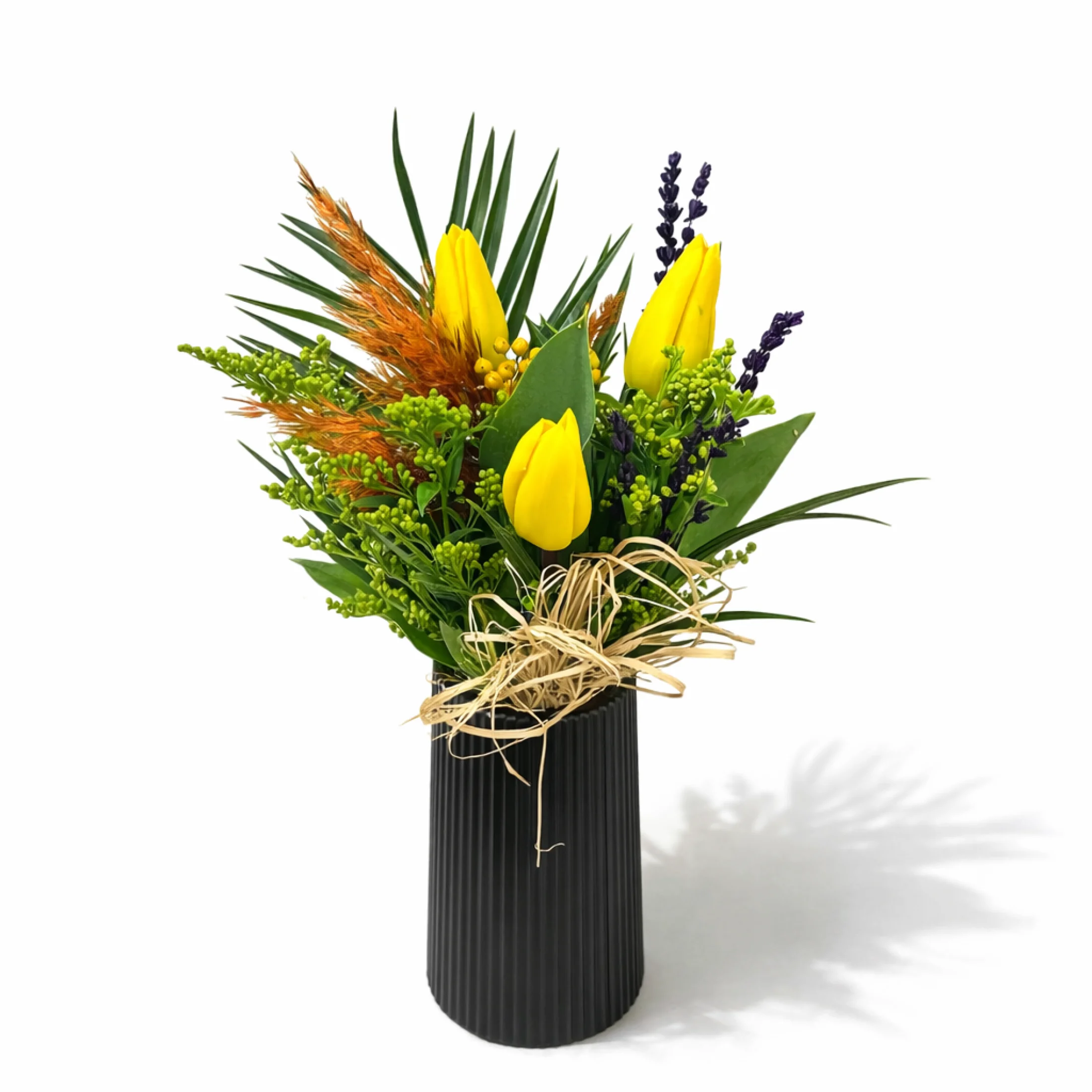 Siyah silindir vazoda hazırlanan bu şık aranjman, sarı lalelerin enerjisi ve lavantanın zarif dokunuşu ile modern bir tasarım sunar. Doğal yeşillikler, kuru başak detayları ve dekoratif rafya süsleme ile hazırlanan bu özel çiçek aranjmanı hem dekoratif hem de hediye olarak tercih edilebilecek zarif bir tasarımdır.
