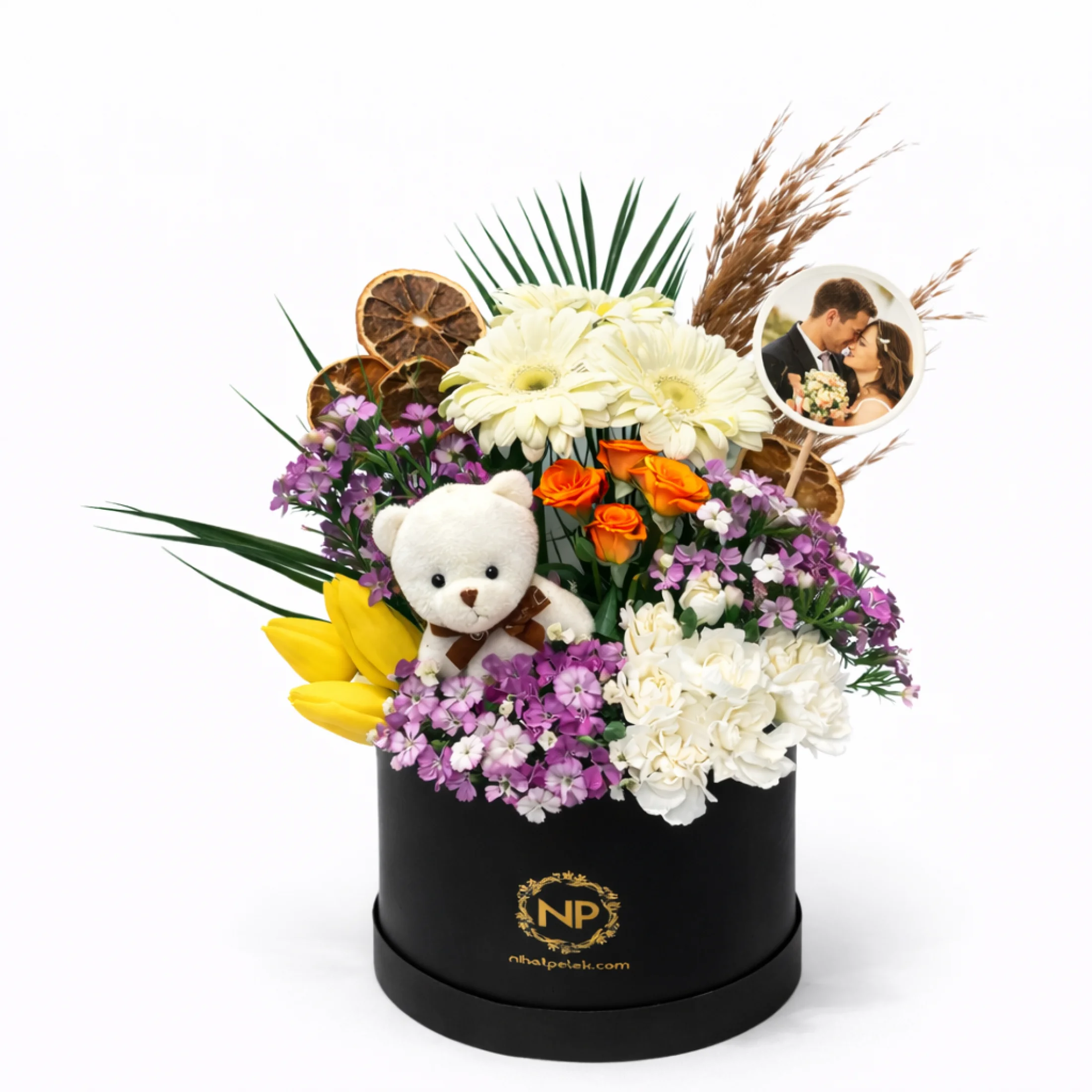 Aranjmanın içerisinde yer alan peluş ayıcık, hediyenize sevimli ve duygusal bir dokunuş katarken; gerbera çiçekleri, mini güller, mevsim çiçekleri ve doğal dekoratif süslemeler tasarıma estetik bir görünüm kazandırır. Kurutulmuş portakal dilimleri ve doğal başak detayları ise aranjmana modern ve doğal bir karakter verir.