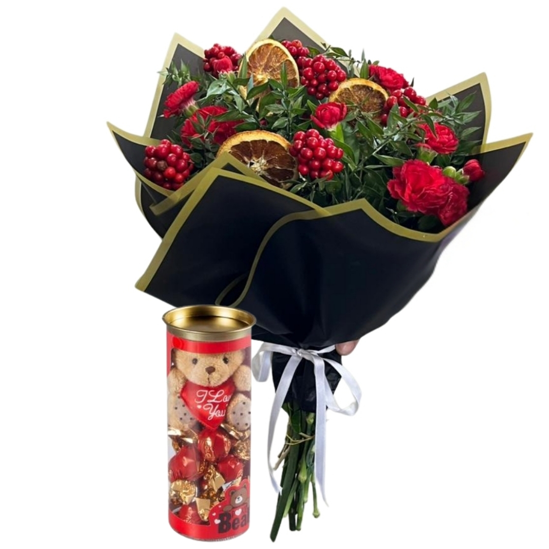 Zarafetle hazırlanmış özel çiçek aranjmanının yanına eklenen silindir kutuda ayıcık figürlü çikolata, hediyeyi çok daha sıcak, samimi ve unutulmaz bir hale getiriyor. Her detayında özen hissedilen bu set, hem görsel olarak hem de duygusal anlamda karşı tarafa değer verdiğinizi hissettiren özel bir kombinasyon sunuyor. Çikolatanın tatlılığı ile çiçeklerin doğal tazeliği bir araya gelerek hem romantik hem de neşeli bir atmosfer yaratıyor. Bu şık ve anlamlı hediye; doğum günü, yıl dönümü, özel kutlamalar veya tamamen içten bir sürpriz için mükemmel bir seçimdir. Sevdiklerine tatlı bir gülümseme bırakmak isteyen herkes için ideal bir aranjmandır.