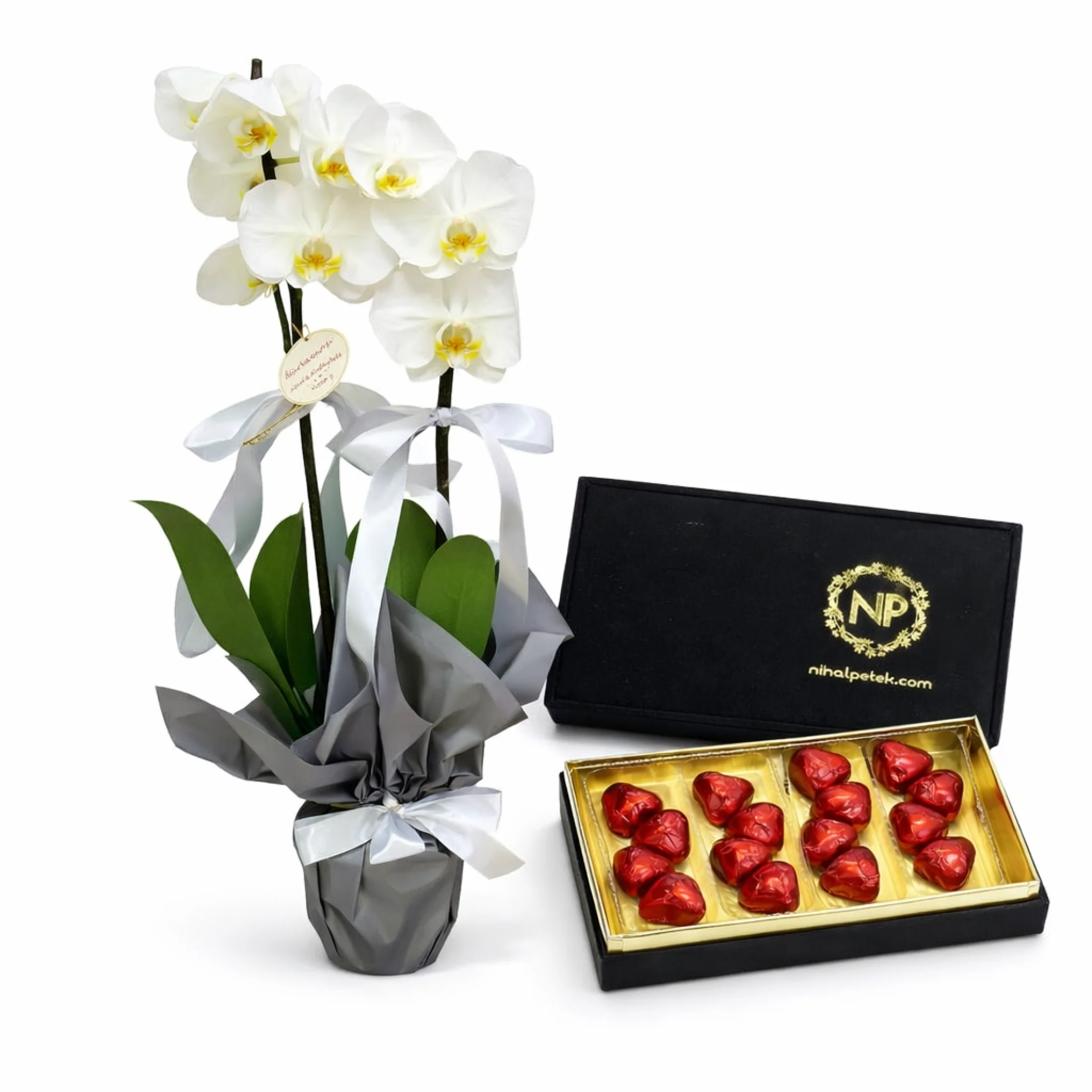 Modern gri ambalaj ve saten kurdele detaylarıyla sunulan canlı Phalaenopsis orkide; şıklığı ve sadeliği temsil ederken, gold detaylı siyah kutu içerisinde yer alan kalp form çikolatalar hediyeye lüks bir dokunuş katar.