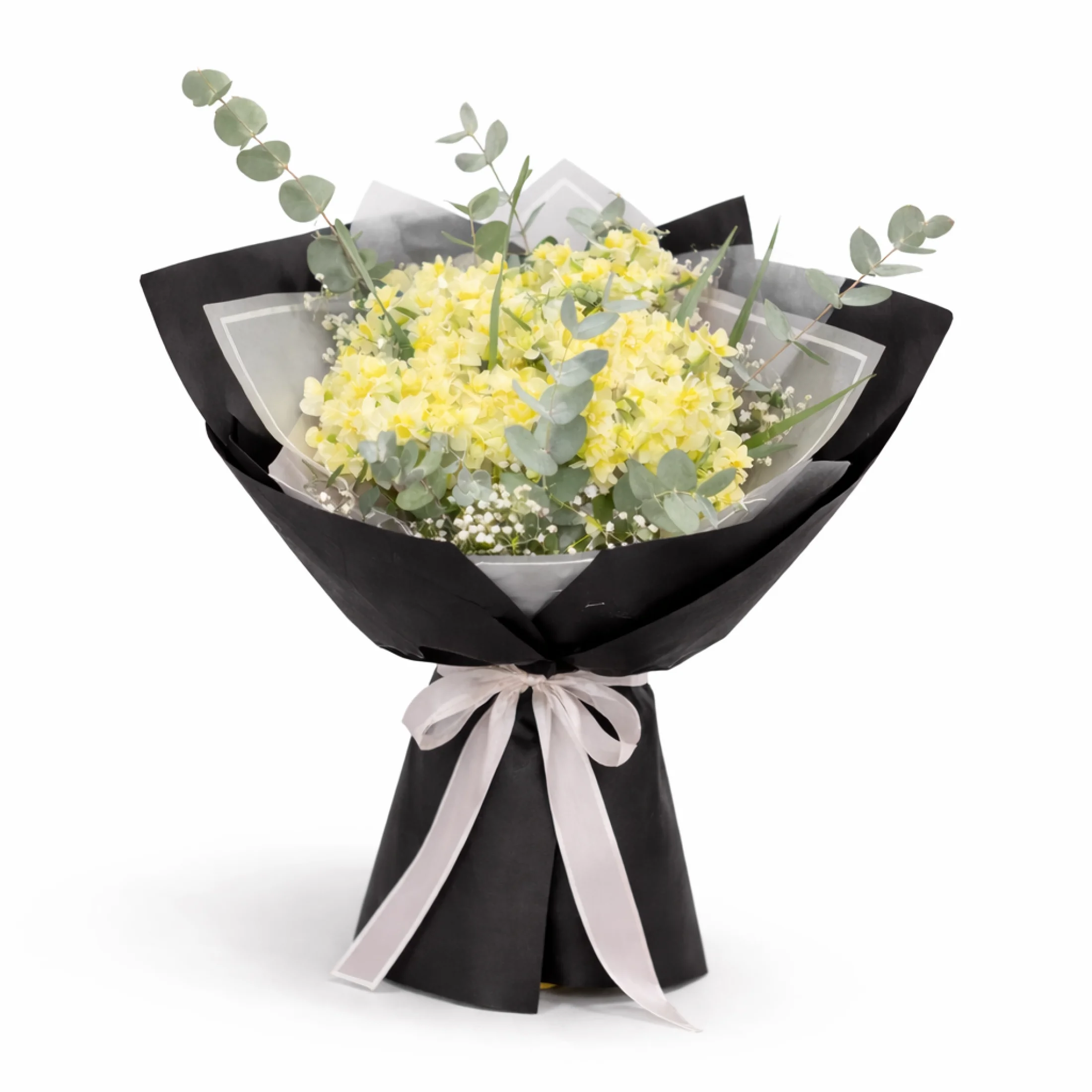 Baharın en zarif çiçeklerinden nergis, okaliptus ve cipso dokunuşlarıyla modern bir şıklık kazanıyor. Siyah buket kâğıdı ve beyaz şeffaf ambalajla hazırlanan bu özel tasarım, sade ama etkileyici bir görünüm sunar.