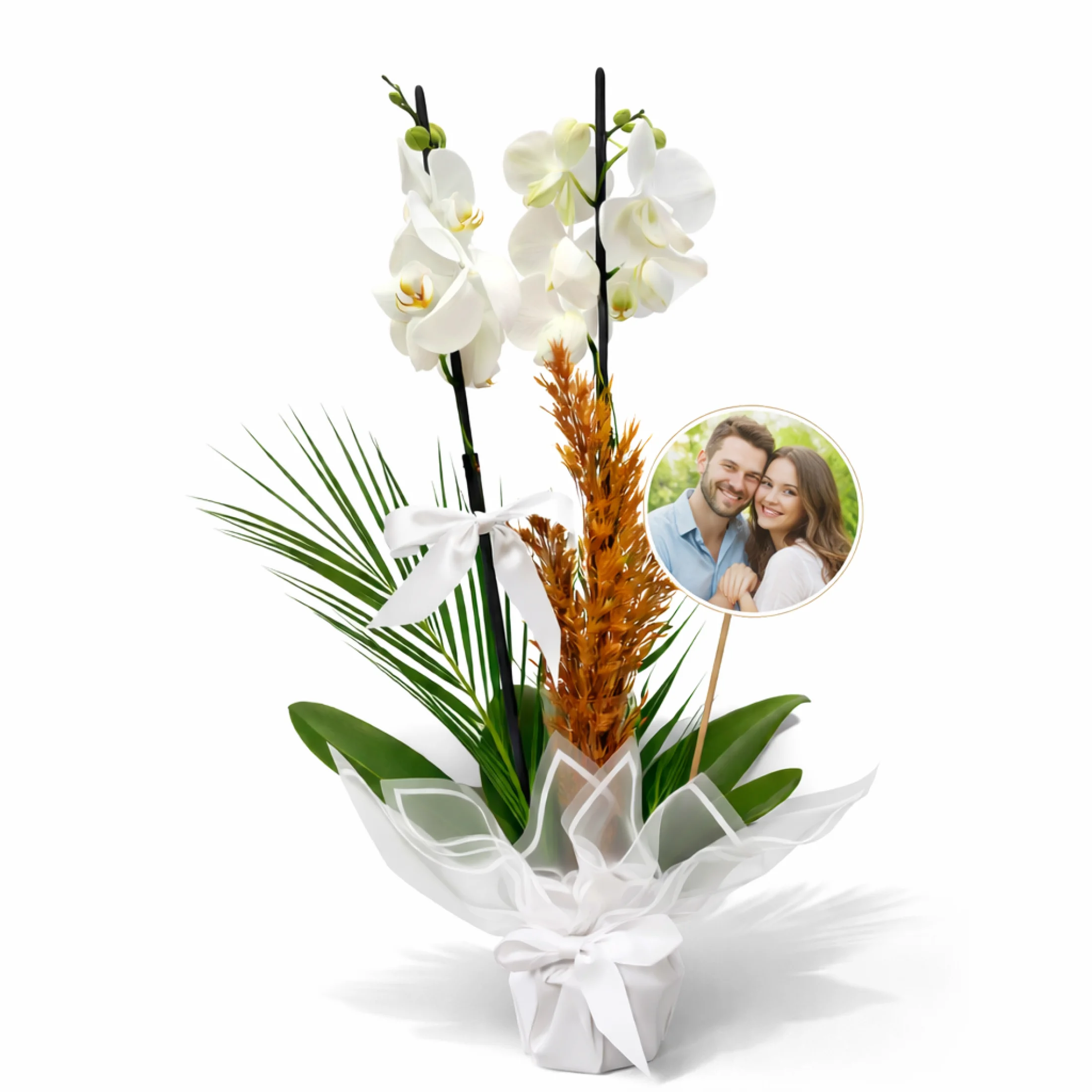 Zarif ve şık görünümüyle dikkat çeken Çift Dal Beyaz Orkide Aranjmanı, özel günlerde sevdiklerinize anlamlı bir hediye sunmanın en elegan yollarından biridir. Doğal palm yaprakları ve dekoratif kuru bitkilerle zenginleştirilen bu orkide tasarımı, modern ve estetik bir görünüm sunar. Şeffaf dekoratif ambalajı ve beyaz kurdelesi ile hazırlanmış bu özel aranjman; doğum günü, yeni iş, tebrik, teşekkür ve özel kutlamalar için mükemmel bir tercihtir.