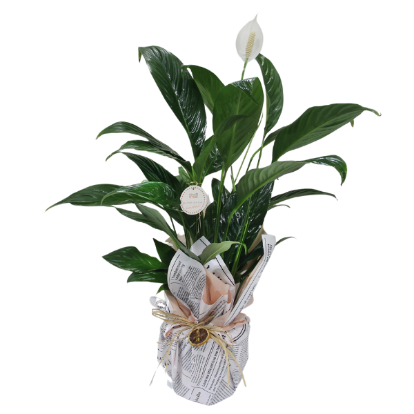 Yaklaşık 50 cm yüksekliğinde siyah çizgili vazo içerisinde Spatifilyum barış çiçeği.