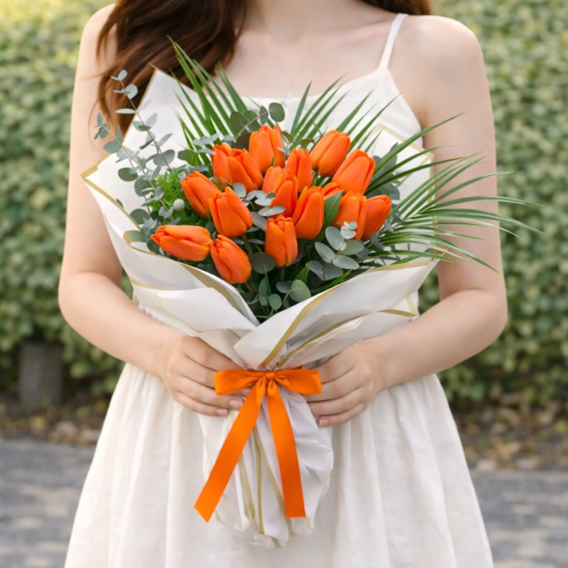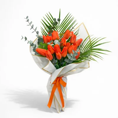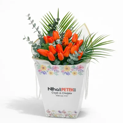 Canlı enerjisi ve göz alıcı rengiyle öne çıkan bu özel aranjman, 20 adet turuncu tonlarında laleden oluşmaktadır. Yaklaşık 35 cm yüksekliğe sahip olan ürün, şık tasarımıyla hem modern hem de zarif bir hediye seçeneği sunar. Okaliptus ve yeşil dokularla zenginleştirilen aranjman, ferah ve premium bir görünüm kazandırır.