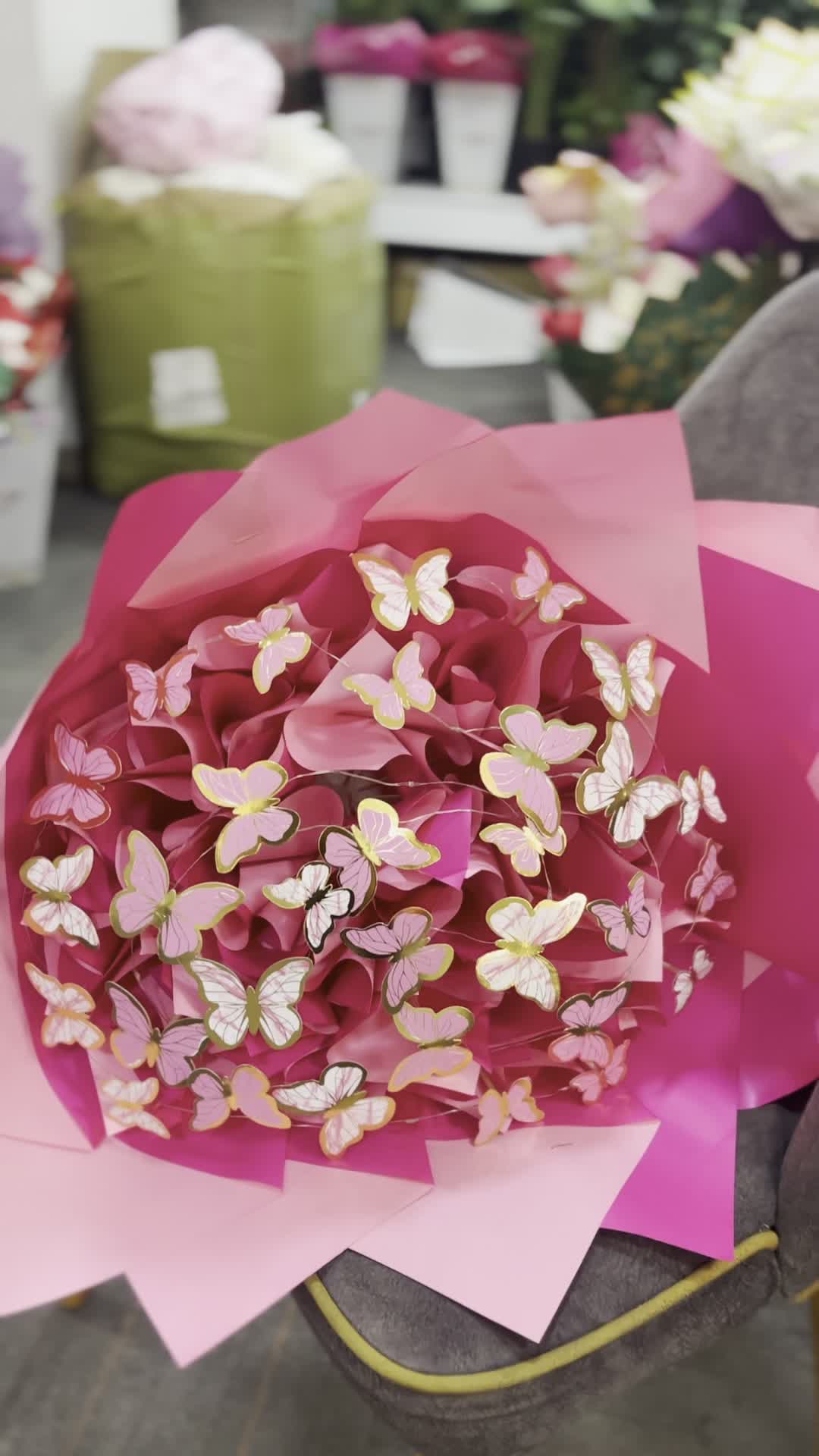 Tatlı Kelebek BuketiPembe kelebek buketi zarafeti ve ışıltısıyla büyüleyici bir görünüm sunuyor. Canlı pembe ve altın tonlarının birleşimiyle hazırlanmış bu özel tasarım, etrafını saran ışık efektleriyle dikkat çekici bir atmosfer oluşturuyor. Her bir kelebek detayı, bukete zarif bir hareket ve canlılık kazandırıyor. Romantik, enerjik ve modern bir tarzı yansıtan bu buket, sevdiklerine farklı bir sürpriz yapmak isteyenler için mükemmel bir tercih. Geceleri hafifçe parlayan ışıklarıyla bulunduğu ortama sıcak ve göz alıcı bir ambiyans katıyor.