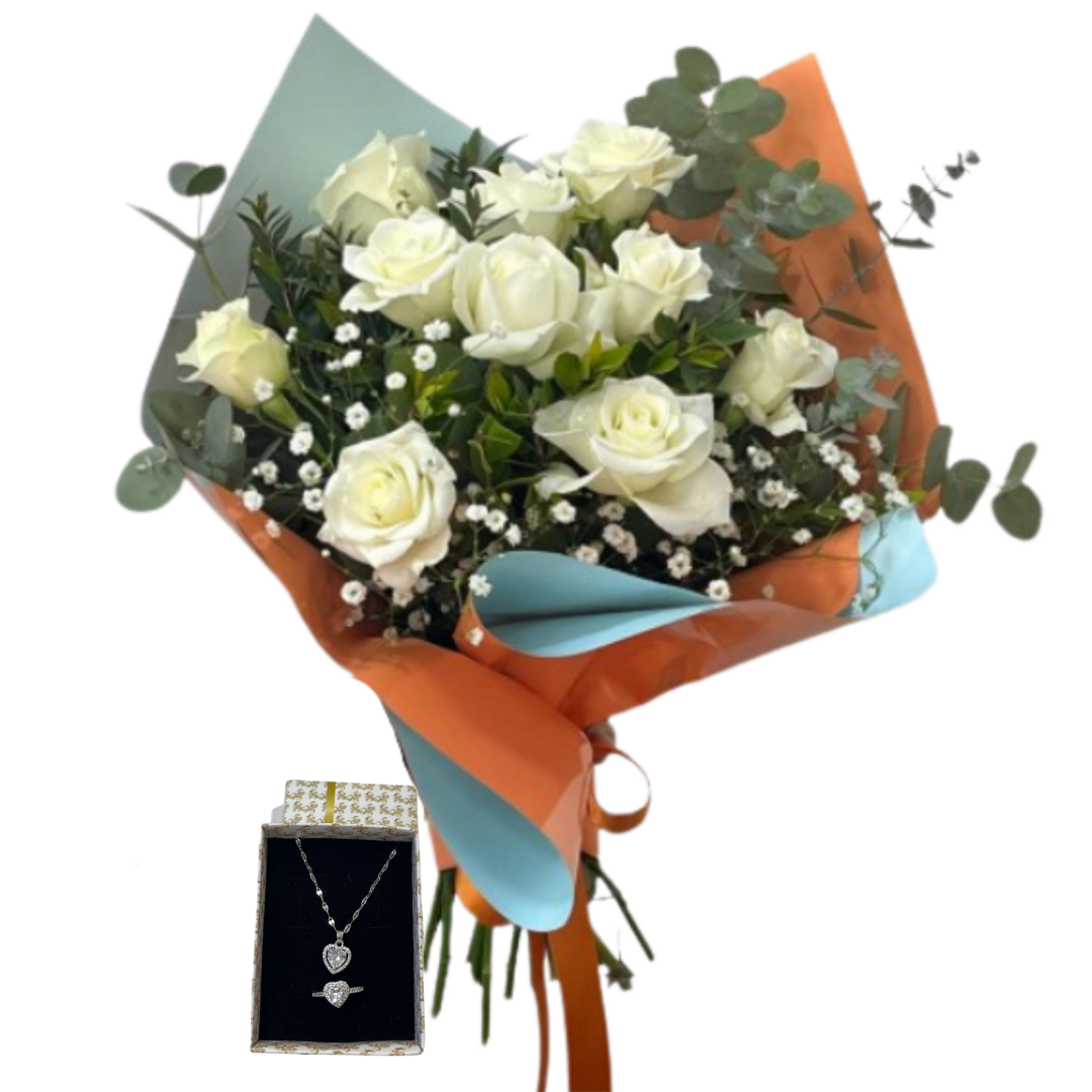 Saten turuncu kurdelesi, okaliptus dalları, mirkeladüsün zarif dokusu, cipsonun hafifliği ve beyaz güllerin saf güzelliğiyle hazırlanmış bu özel buket; mavi–turuncu buket kâğıdının modern görünümüyle tamamlanıyor. Şıklığı, sadeliği ve uyumlu renk geçişleriyle dikkat çeken aranjman, yanında hediye edilen beyaz pandora kolye–yüzük seti ile hem zarafeti hem de anlamı bir araya getiriyor. Özel günlerde unutulmaz bir sürpriz yapmak isteyenler için ideal bir seçim.