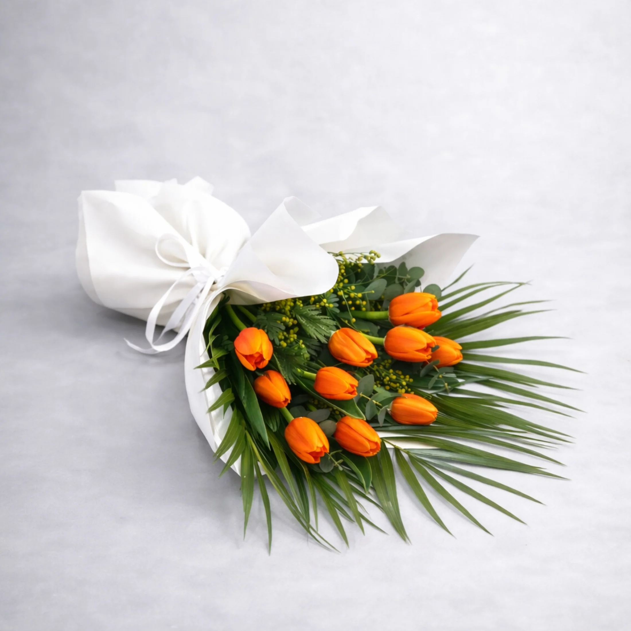 Canlı turuncu lalelerin enerjisini, modern ve zarif bir tasarımla bir araya getirdik. Beyaz buket kağıdıyla sade bir şıklık kazanan bu özel aranjman; taze yeşillikler ve doğal dokularla tamamlanarak hem göz alıcı hem de sofistike bir görünüm sunar.