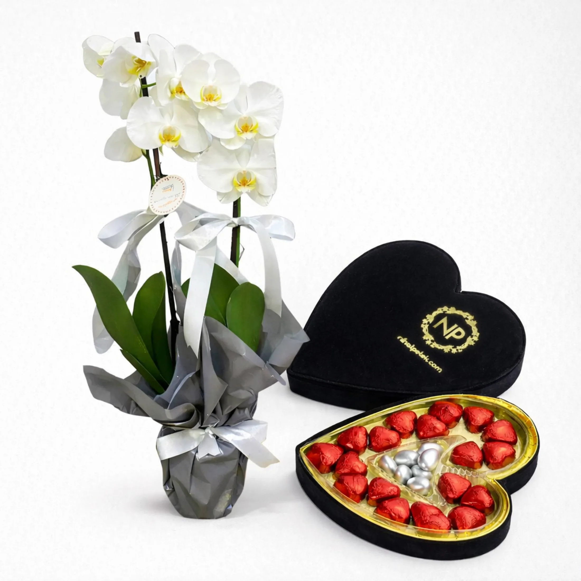 VIP Beyaz Orkide & Kalp Çikolata Seti