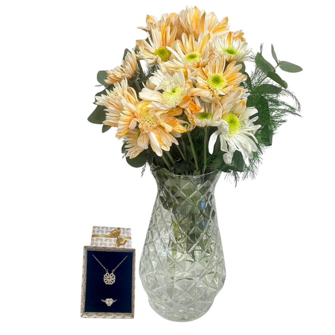 Turuncu kasımpatının sıcak enerjisi, okaliptusun ferah yeşilliği ve virgatüsün doğal zarafetiyle buluşarak etkileyici bir uyum oluşturur. Kristal silindir cam vazo içinde zarafetle sunulan bu aranjman, doğanın canlı tonlarını ve şıklığı bir araya getirir. Yanında yer alan açılıp kapanan kalpli yonca kolye ve yüzük seti ise şansa, sevgiye ve zarafete gönderme yapan anlamlı bir detay ekler. Sıcacık turuncu tonlarıyla bulunduğu ortama neşe ve canlılık katarken, anlamlı hediyesiyle de kalplerde iz bırakır.