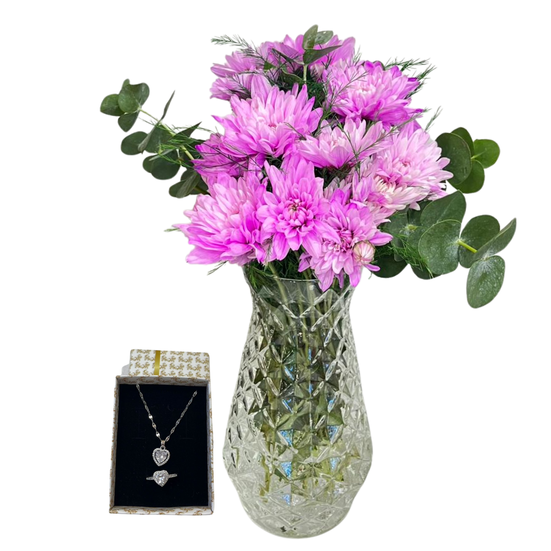 Kristal silindir vazonun içinde özenle yerleştirilmiş pembe kasımpatılar, taze okaliptus dalları ve zarif virgatüslerle hazırlanan bu aranjman, beyaz pandora kolye ve yüzük setiyle tamamlanarak sade bir şıklığa dönüşüyor. Kristal vazonun parlaklığıyla pandoranın zarafeti birbirini kusursuzca tamamlıyor. Göz alıcı kolye ve yüzük seti, çiçeklerin zarif tonlarıyla uyum içinde parlayarak sevginin en zarif halini temsil ediyor.